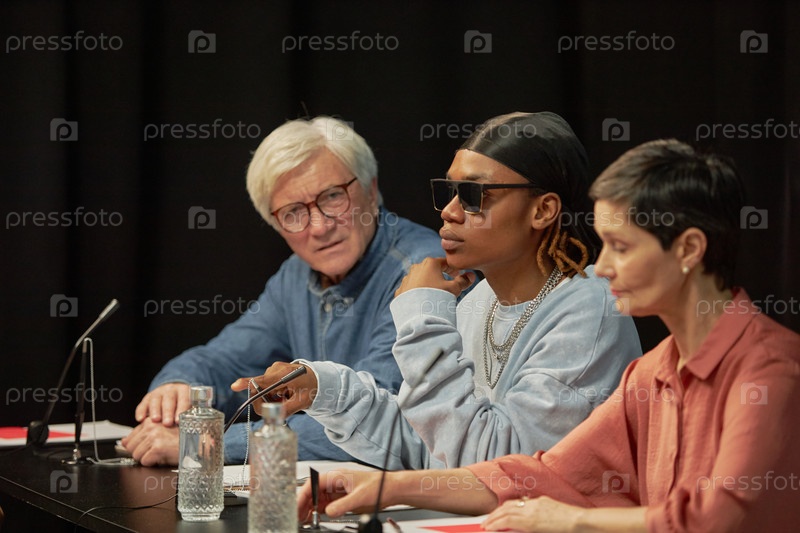 Разнообразная группа судей оценивает выступления во время конкурса талантов