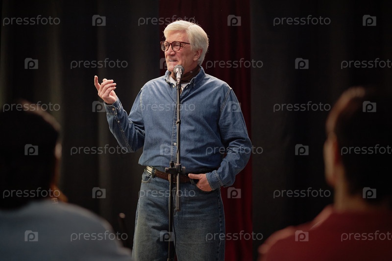 Старший мужчина развлекает аудиторию рассказами на конкурсе талантов