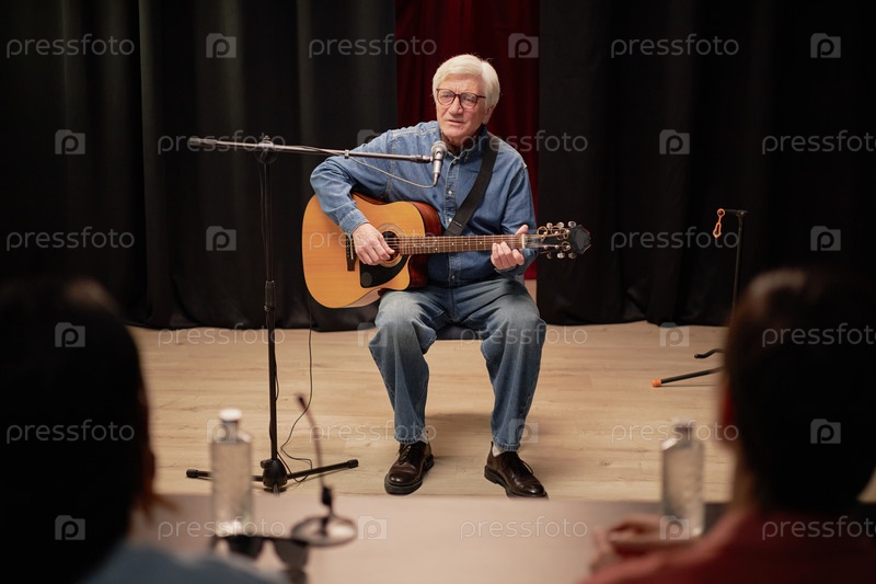 Мужчина, демонстрирующий музыкальный талант с гитарой перед старшими судьями