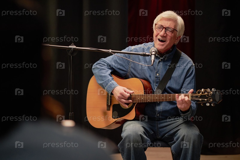 Мужчина поет и играет на гитаре на сцене во время старшего конкурса талантов