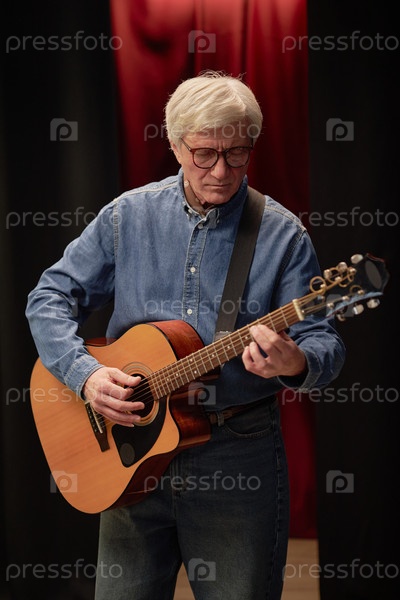 Зрелый мужчина выступает на сцене, играя на акустической гитаре на конкурсе талантов