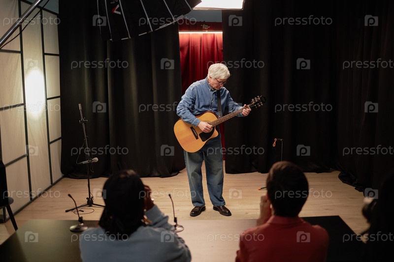 Старший мужчина, исполняющий гитарное соло на сцене во время конкурса талантов
