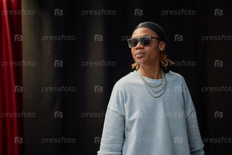 Молодой взрослый чернокожий мужчина в солнцезащитных очках выступает на конкурсе талантов
