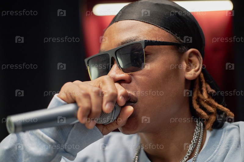 Молодой чернокожий мужчина исполняет рэп на сцене во время конкурса талантов