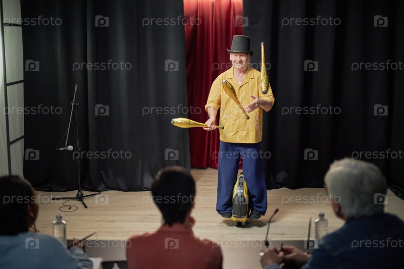 Жонглирующие клубы, одновременно балансируя на одноколесных мужчинах