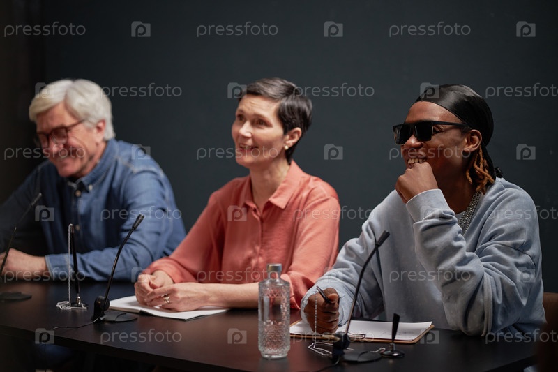 Разнообразная группа судей среднего возраста и молодых взрослых, оценивающих конкурс талантов
