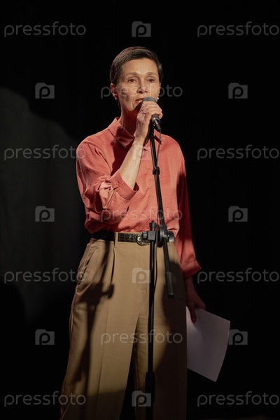 Портрет женщины среднего возраста, выступающей на сцене во время конкурса талантов