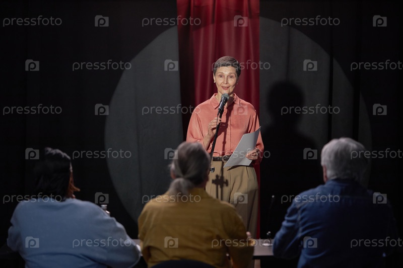 Женщина среднего возраста, выступающая с монологом перед судьями на конкурсе талантов