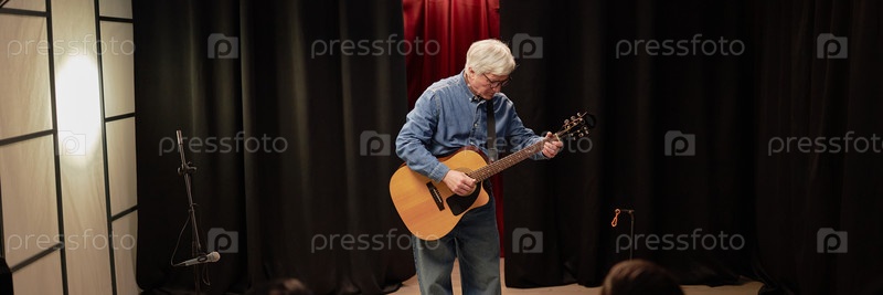 Старший мужчина исполняет соло с акустической гитарой во время конкурса талантов