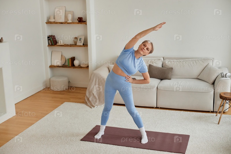 Старшая женщина растягивает руку во время упражнений на йога-матке в помещении