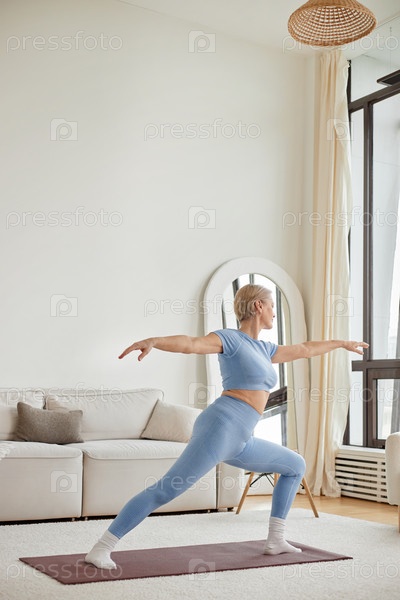 Взрослая женщина практикует йогу, позируя в яркой гостиной