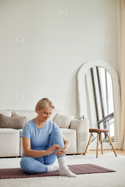 Пожилая женщина сидит на йога-матке, используя смартфон дома
