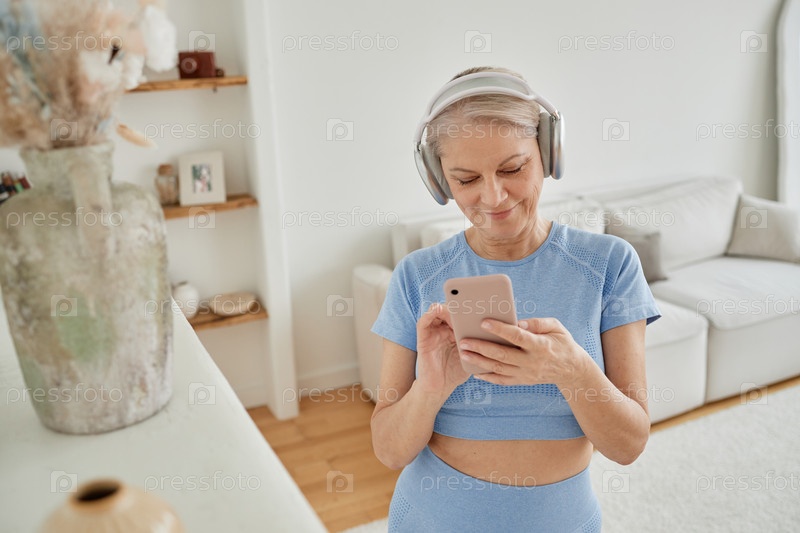 Пожилая женщина улыбается, слушая музыку и пользуясь смартфоном