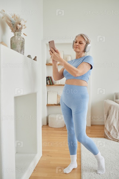 Пожилая женщина слушает музыку и использует смартфон в помещении