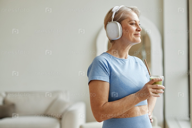 Пожилая женщина наслаждается смузи, слушая музыку в помещении