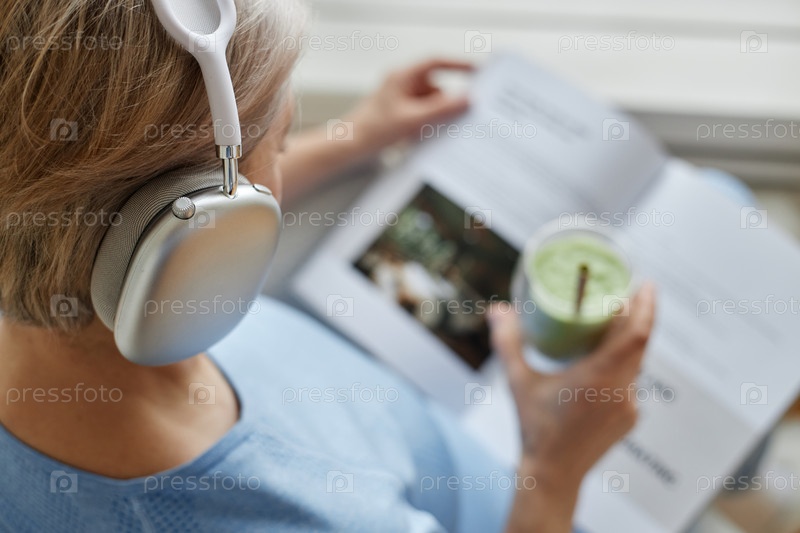 Пожилая женщина слушает музыку, читая и выпивая смузи