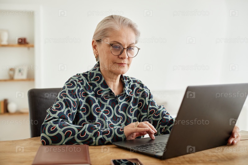 Пожилая женщина использует ноутбук, работая удаленно в домашнем офисе