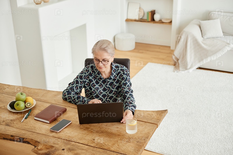Пожилая женщина использует ноутбук, сидя за деревянным столом в помещении