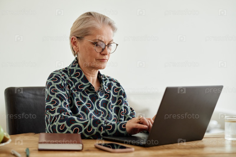 Старшая женщина, работающая удаленно с помощью ноутбука на деревянном столе