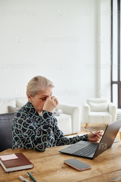 Пожилая женщина испытывает стресс во время работы на ноутбуке за рабочим столом