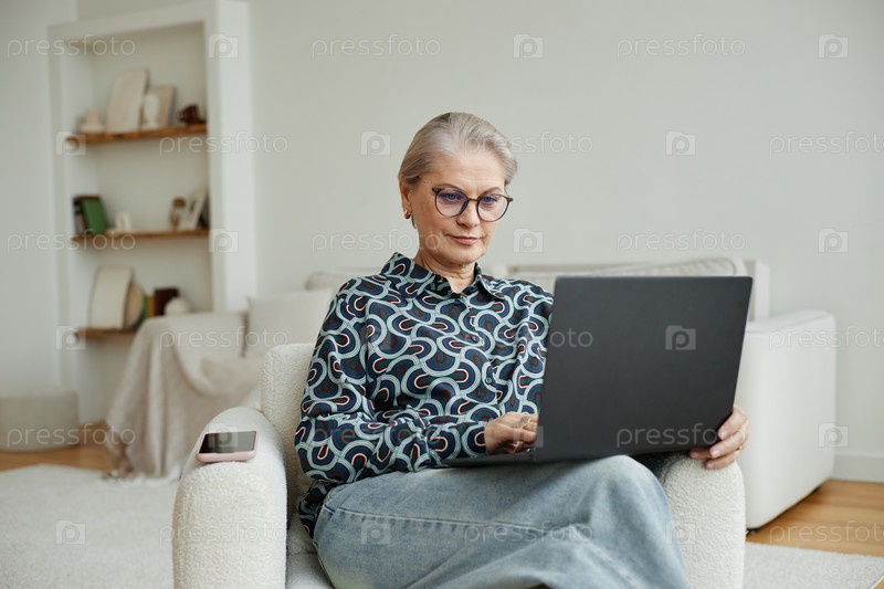 Старшая женщина сидит в помещении, используя ноутбук и концентрируясь