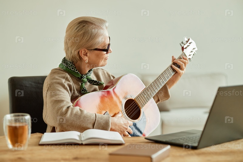 Старшая женщина играет на гитаре, учась онлайн дома