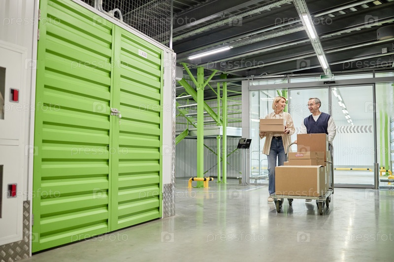 Женщина и мужчина среднего возраста перемещают коробки в хранилище