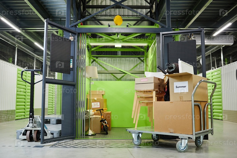 Домашние предметы и картонные коробки хранятся внутри самостоятельного хранилища