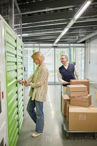Женщина среднего возраста открывает шкафчик, пока мужчина ждет