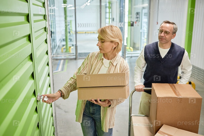 Женщина среднего возраста разблокирует блок хранения, в то время как мужчина держит коробки