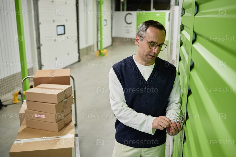 Мужчина среднего возраста открывает дверь хранилища в складе