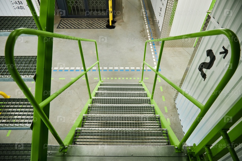 Металлическая лестница с зелеными рельсами, ведущими вниз на промышленном складе
