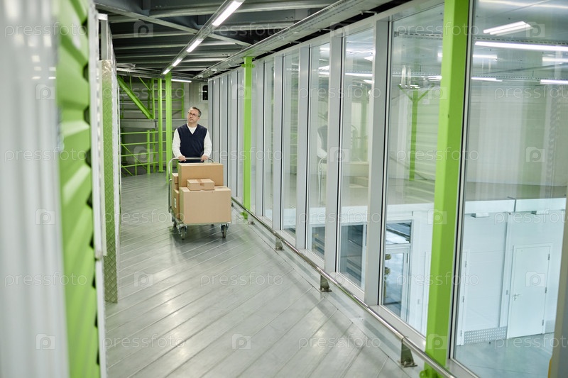Мужчина средних лет толкает тележку с коробками в коридоре современного склада
