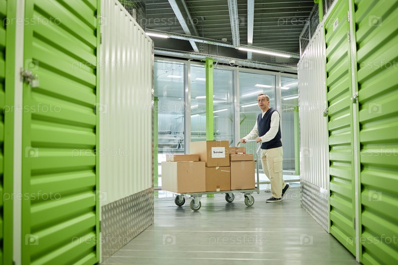 Человек среднего возраста колесная тележка загружена посылками через коридор хранения
