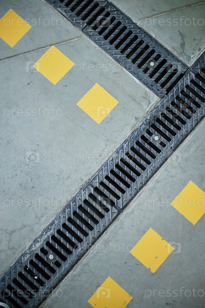 Диагональные штормовые дренажи пересекают бетонный пол с желтыми знаками безопасности