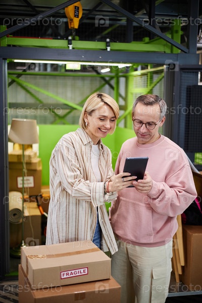 Мужчина среднего возраста и женщина, использующие цифровые планшеты на складе