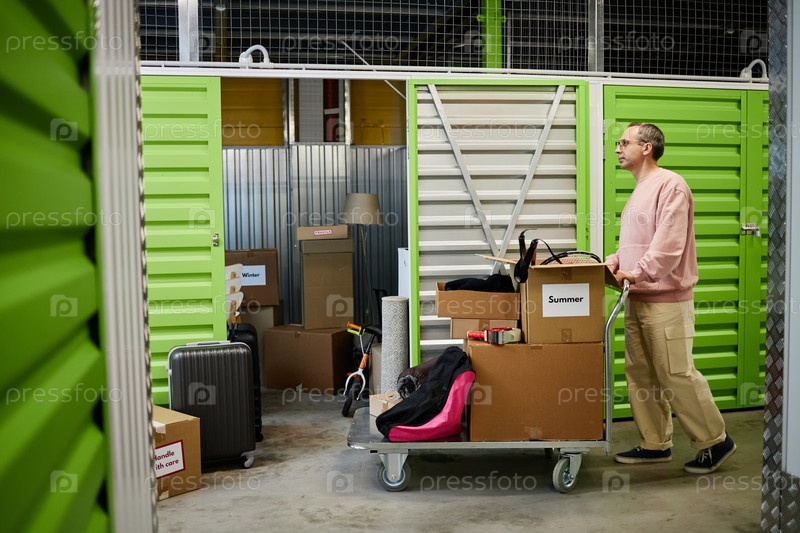Мужчина среднего возраста организует коробки в самостоятельном хранилище