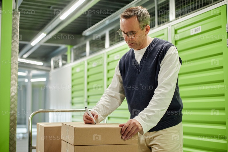 Мужчина средних лет пишет на картонных коробках в хранилище