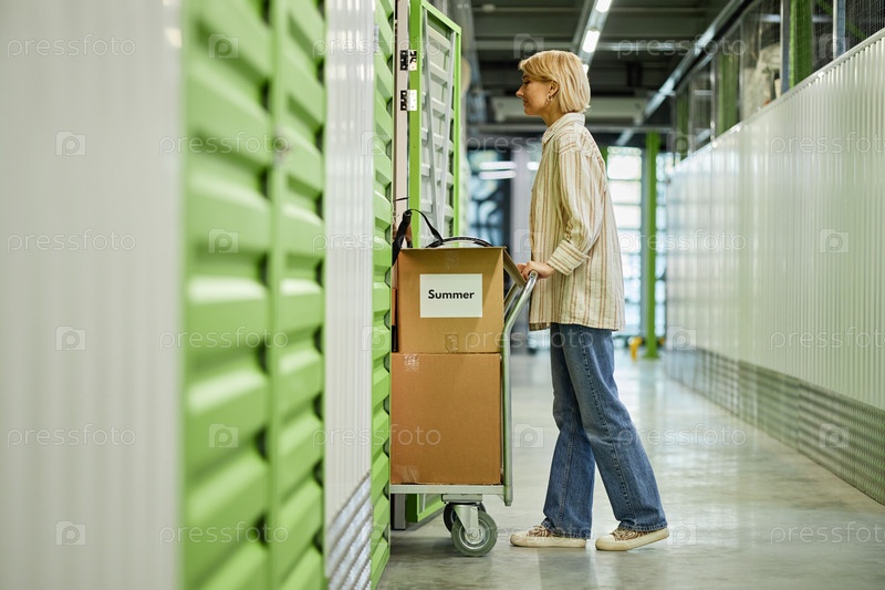 Женщина, хранящая картонные коробки в самостоятельном хранилище