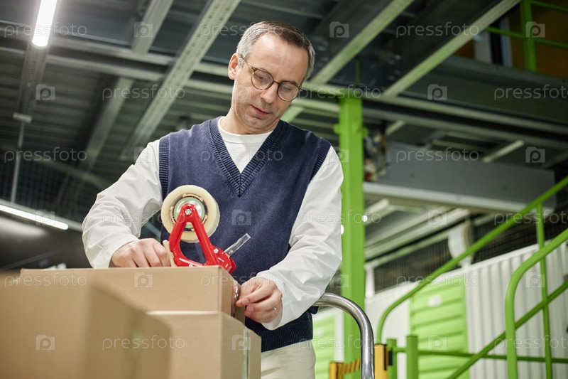 Мужчина среднего возраста запечатывает картонную коробку с пакетной лентой