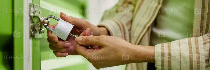 Женщина блокирует хранилище с замком и ключом