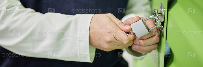 Непризнанный человек запирает дверь шкафа с замком в офисной обстановке