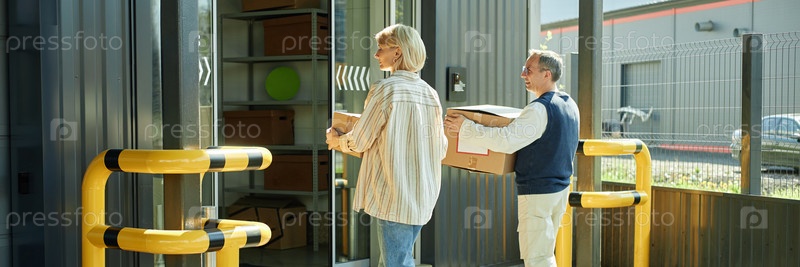 Мужчина среднего возраста и женщина, несущие коробки