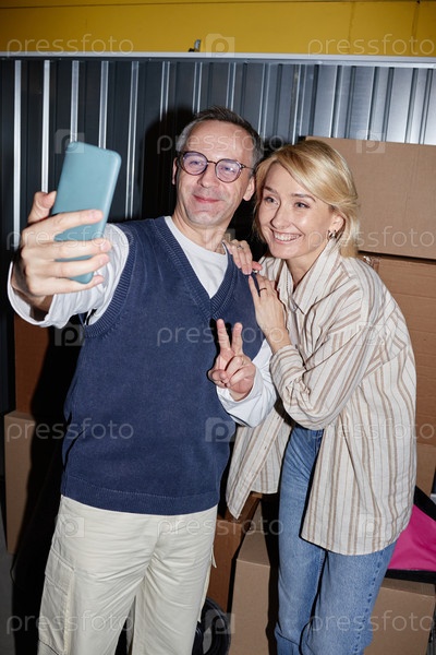 Мужчина и женщина средних лет делают селфи и улыбаются в помещении