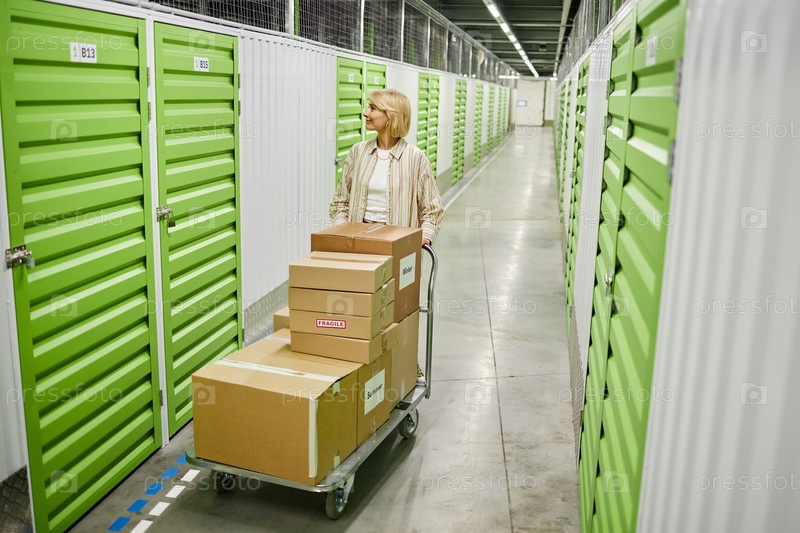 Женщина среднего возраста толкает корзину с коробками в хранилище