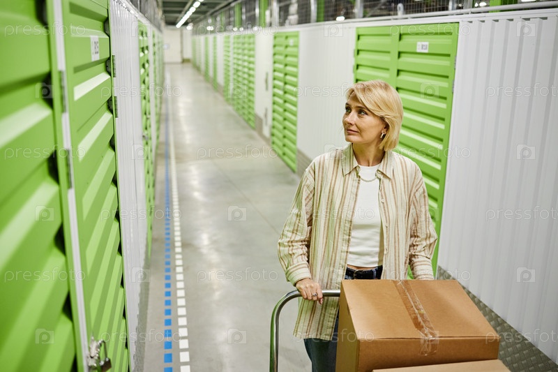 Женщина среднего возраста толкает корзину с коробками в самостоятельном хранилище