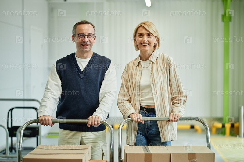 Портрет мужчины и женщины среднего возраста, улыбающихся во время перемещения ящиков
