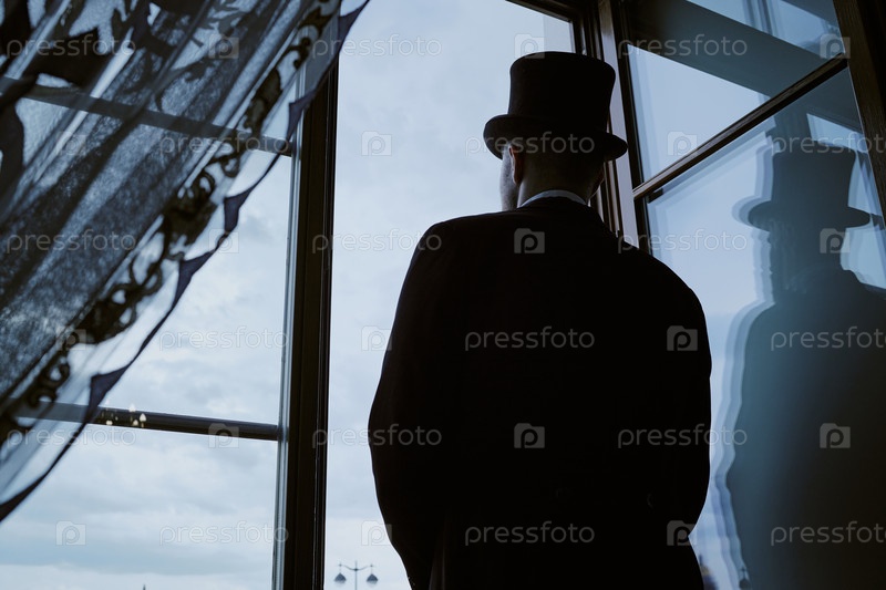 Мужчина среднего возраста в верхней шляпе стоит у окна и смотрит наружу