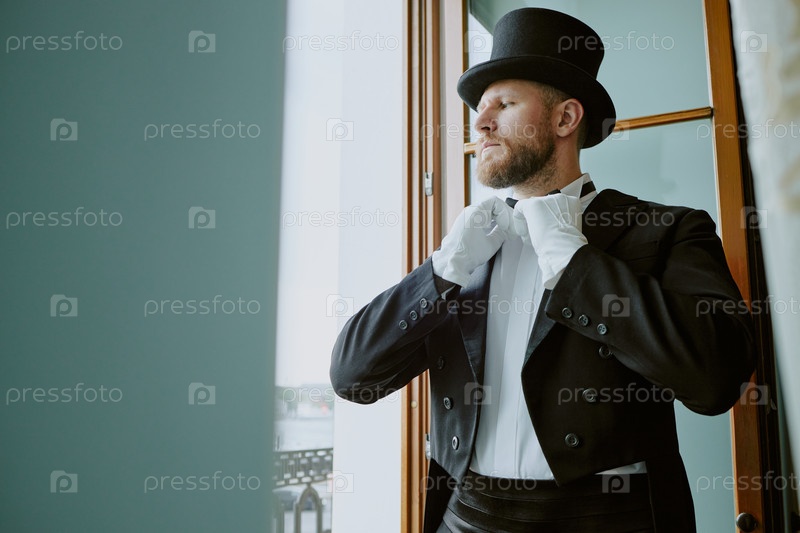 Молодой взрослый мужчина корректирует галстук во время стояния возле окна