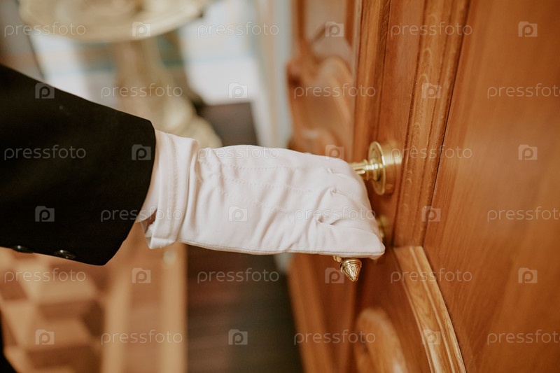Ручная перчатка для открытия деревянных дверей в помещении мужчина